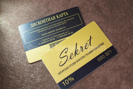 РПК «Фасад Медиа Групп» занимается разработкой дизайна, а также изготовлением пластиковых карт, дисконтных карт, подарочных сертификатов на профессиональной основе. Работы выполняем «под ключ»: