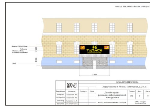 Процесс проектирования вывески, если она является рекламной или художественной, должен заканчиваться получением разрешения на изготовление и установку рекламной конструкции. На данном этапе технический проект направляется в государственные органы, чтобы получить разрешение на изготовление и установку рекламной конструкции по заявленным характеристикам и на указанном в техническом проекте месте.