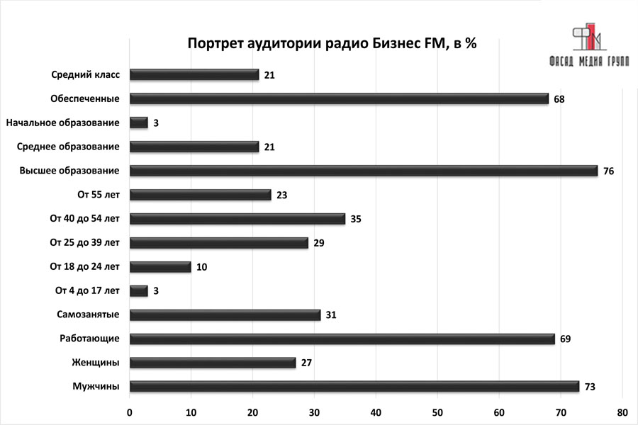 Аудитория «Business FM» рекламу воспринимает более внимательно: владельцы бизнеса не спешат. Профиль аудитории: руководители, менеджеры с высшим образованием, имеющие собственный бизнес, обладающие высоким доходом, ведущие активный образ жизни, любящие путешествие и спорт. Важным сегментом аудитории «Business FM» являются водители – обеспеченные и влиятельные люди за рулем, а также их пассажиры. Радио «Бизнес ФМ» ориентировано на состоятельную аудиторию, которую интересуют как валютные курсы и индексы, так и решения правительства, политика, геополитика, новости в сфере бизнеса, события мира моды и т.д.
