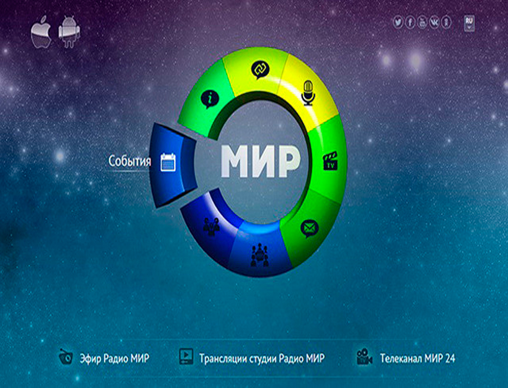 Мир – это международная телерадиокомпания (МТРК), которая была основана соглашением глав государств-участников СНГ 9 октября 1992 г. В состав МТРК «Мир» входят телеканалы «Мир», «Мир 24», «Мир HD», радиостанция «Мир», а также информационно-аналитический портал «MIR24.TV». Головной офис находится в Орехово-Зуево; филиалы и представительства – в 9 странах СНГ. Вещание осуществляется на русском языке. Председателем МТРК «Мир» и руководителем одноименного канала является Радик Батыршин. С 2017 г. слоганом МТРК «Мир» является фраза: «Телеканал многих столиц».