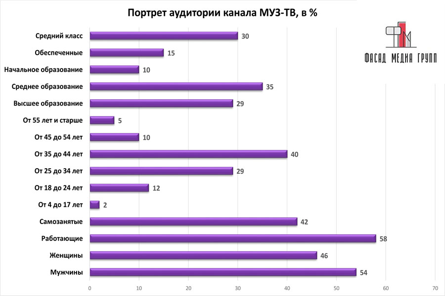 Благодаря качественному, сбалансированному контенту аудитория «МУЗ-ТВ» многочисленна и разнообразна.
