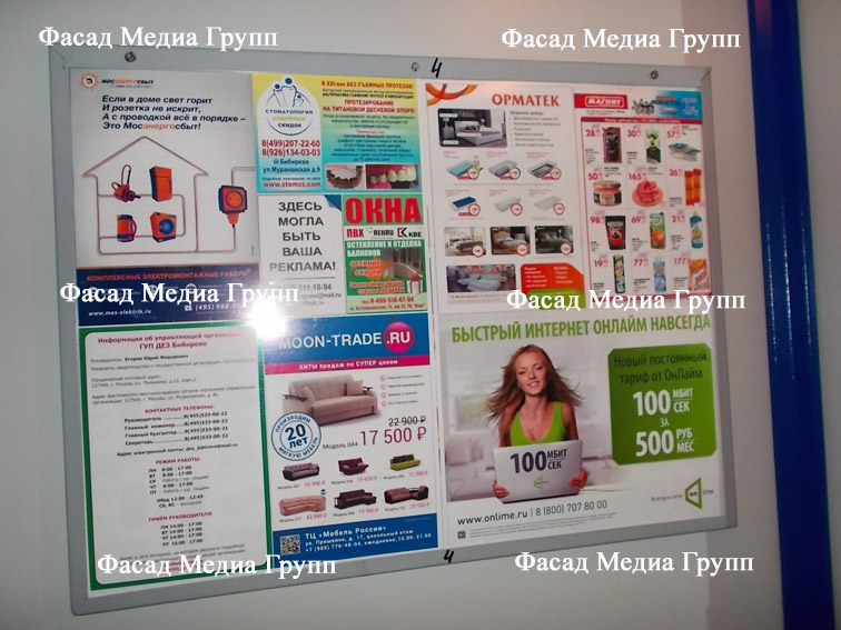 Как указывалось выше, реклама в лифтах представлена различными форматами, одним из которых является плакат, размещаемый на информационном стенде. Многие клиенты нашего рекламного агентства задают вопрос о том, как печатается реклама для размещения в лифтовых кабинах? Отвечая на данный вопрос, специалисты Фасад Медиа Групп сообщают, что перед печатью макеты разных клиентов объединяются в единый макет, который и распечатывается одним общим плакатом. При этом, размер данного общего плаката соответствует формату А0.