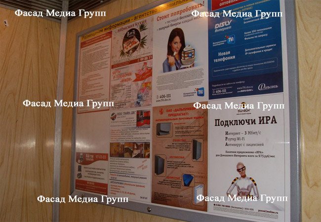 Многие дома в городах оборудованы лифтовыми кабинами. Практически в каждом лифте установлен так называемый лифтборд, на котором размещаются рекламные материалы. Однако возникает вопрос: каким образом рекламные материалы монтируются на лифтбордах? Размещение рекламы в лифтах осуществляет наше рекламное агентство, т.к. у нас заключены соответствующие договоры с управляющими компаниями, ТСЖ и т.д. Специалисты Фасад Медиа Групп производят монтаж рекламы применяя специальные крепежные инструменты для лифтборда.