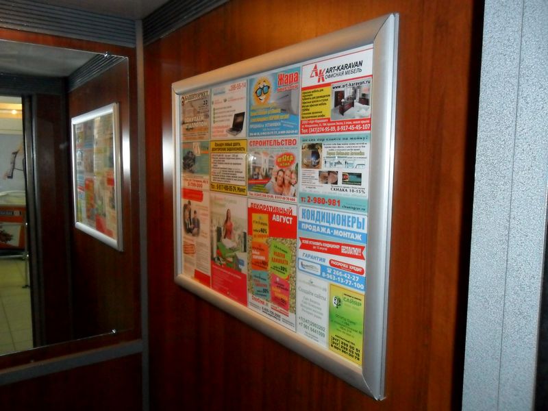 Монтаж рекламы в лифтах осуществляется по-разному в зависимости от того, какой рекламный материал размещается.